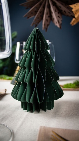 Leder du efter ny julepynt, der kan tilføje et moderne twist? Så finder du her dette papirtræ, der har form som et juletræ. Træet har en flot har guld glimmer langs kanterne, som giver et moderne udtryk til din julepynt. Du kan bl.a. stille julepynten på reoler, hylder og vindueskarme og sammen med den øvrige julepynt skabe en julestemning. Julepynten måler Ø: 13 cm x H: 20 cm.