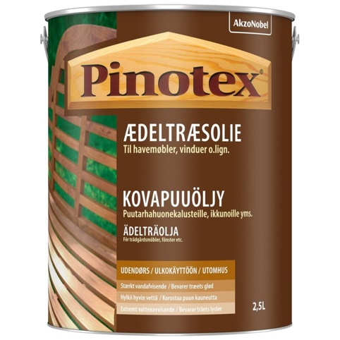 Med Pinotex ædeltræsolie kan du holde dine havemøbler og andet udendørs smukt og forlænge dets levetid. Ædeltræsolien er en plejende olie, der beskytter træet mod nedbrydning af solens UV-stråler og overfladebegroninger som alger og skimmelsvamp. Olien er specielt udviklet til eksotiske og mørke træsorter som teak, nyatoh, bangkirai, mahogni og meranti m.fl., hvor den vil give en naturlig finish, der fremhæver træets smukke, gyldne nuance.