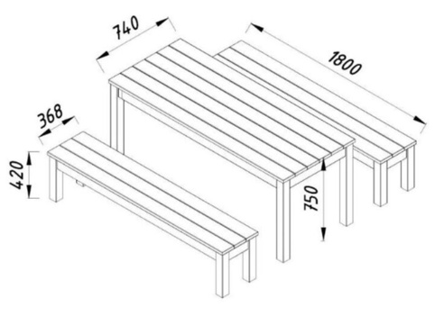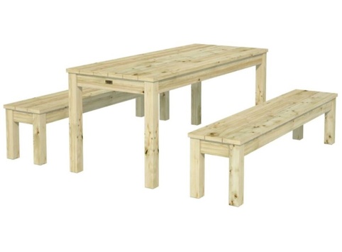 Plankesættet er af grøn-trykimprægneret nordisk gran. Bordet måler L: 180 cm x B: 74 cm x H: 75 cm, og hver bænk måler L: 180 cm x B: 36,8 cm x H: 42 cm. Produktet er FSC®-mærket.