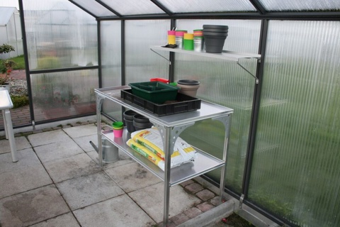 Få mere arbejds- og afsætningsplads i drivhuset med et universalbord i aluminium. Bordet giver en praktisk base til prikling, ompotning og klargøring af planter, samtidig med at du får ekstra plads til f.eks. såbakker, potter og jord. Bordet leveres med to arbejdsplader i plast, som gør det nemt at holde bordet rent i hverdagen.