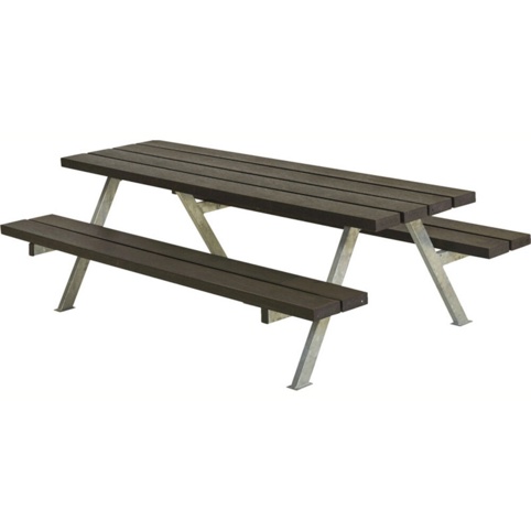 Sættet er produceret i ReUsed plast, som er 100 % genanvendt plast, og stellet er af varmgalvaniseret stål. Overfladen har en ensartet struktur – og produktet kræver ingen efterbehandling eller vedligeholdelse. Dette bord-/bænkesæt er i farven sort. Bænkene måler L: 177 cm x B: 24,5 cm x H: 32,5 cm, og bordpladen måler L: 177 cm x B: 50 cm x H: 57 cm. Stellet måler B: 30 mm x T: 50 mm. Plankerne måler T: 42 mm x B: 120 mm.