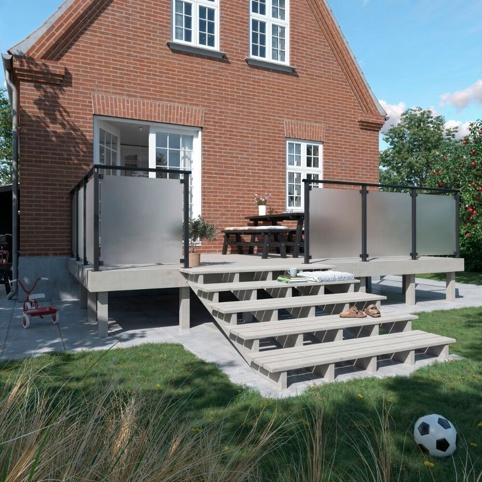 Glashegn i frosted lamineret glas – velegnet til altan og høj terrasse