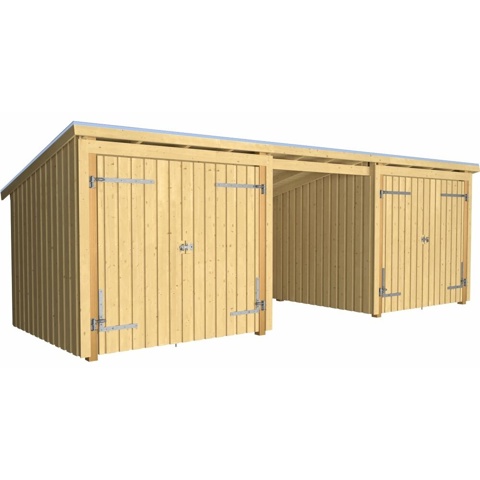 På udkig efter en smart løsning til opbevaring af alle dine haveredskaber og -møbler? Så finder du her et multi-havehus, som er en fleksibel løsning. Dette skur har et areal på 14 m² og måler L: 635 cm x B: 218 cm x H: 169/220 cm. Denne model består af 3 moduler – 2 med dobbeltdør og 1 åben. Derudover medfølger beslag og skruer. Skuret er af ubehandlet nåletræ. Hvis du ønsker det, kan du vælge at male træet i ønsket farve. Produktet er FSC®-mærket.