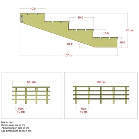 Trappen vil få en hældning på 19°. Trappevangerne og brædderne er af NTR-A trykimprægneret fyrretræ, som betyder, at træet er beskyttet mod råd og tåler jordkontakt. Vi anbefaler et spænd på 40 cm mellem trappevangerne. Produktet er FSC®-mærket.