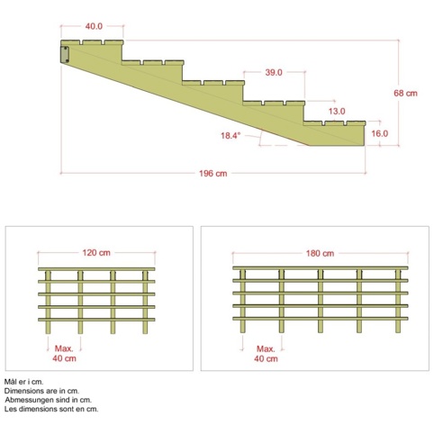 Trappen vil få en hældning på 19°. Trappevangerne og brædderne er af NTR-A trykimprægneret fyrretræ, som betyder, at træet er beskyttet mod råd og tåler jordkontakt. Vi anbefaler et spænd på 40 cm mellem trappevangerne. Produktet er FSC®-mærket.