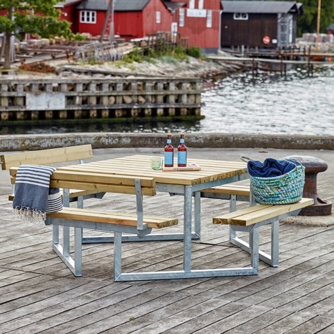 Twist-bord-/bænkesættet her findes i flere forskellige varianter – både med og uden ryglæn. Det er fremstillet af trykimprægneret nåletræ. Dette betyder, at træet er beskyttet mod mikrobiel nedbrydning ved råd, svampe- og insektangreb. Produktet er FSC®-mærket.