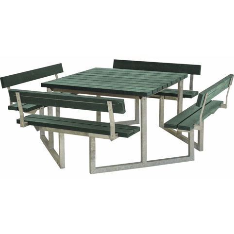 Den tilhørende bordplade måler L: 118 cm x B: 118 cm x H: 73 cm, som skaber god plads til fællesspisning og andre aktiviteter. Det varmgalvaniserede stålstel har en tykkelse på 45 mm, og trælængderne har målene T: 40 mm x B: 120 mm. De integrerede bænke måler L: 118 cm x B: 25 cm x H: 45 cm.