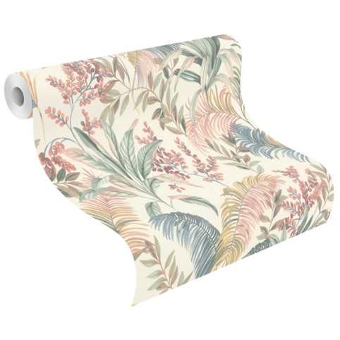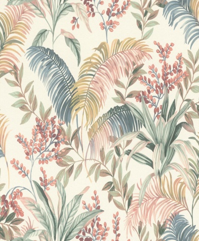 Dette flotte tapet fra Rasch har palmeblade og tropiske planter i harmoniske farver. Det fine tapet passer godt ind flere steder i hjemmet og er særlig velegnet i kombination med naturlige materialer som træ, rattan, planter m.v. Én rulle tapet har en bredde på 53 cm og en længde på 1005 cm.