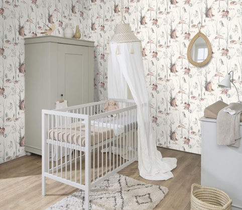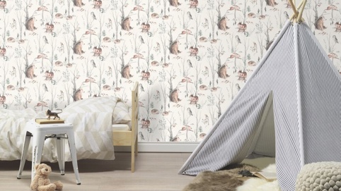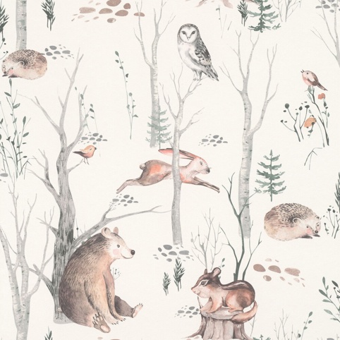 Dette fine tapet fra Rasch har charmerende dyreprint af bjørne, harer, ugler, pindsvin, sangfugle og jordegern rundt i skoven. Motiverne er i rolige farver af beige, brun og grå med lavmælte nuancer af orange og grøn. Det skaber en rolig stemning, der er perfekt til børneværelset. Her vil det være flot både alene på én eller flere vægge eller kombineret med et andet ensfarvet tapet. Én rulle tapet har en bredde på 53 cm og en længde på 1005 cm.