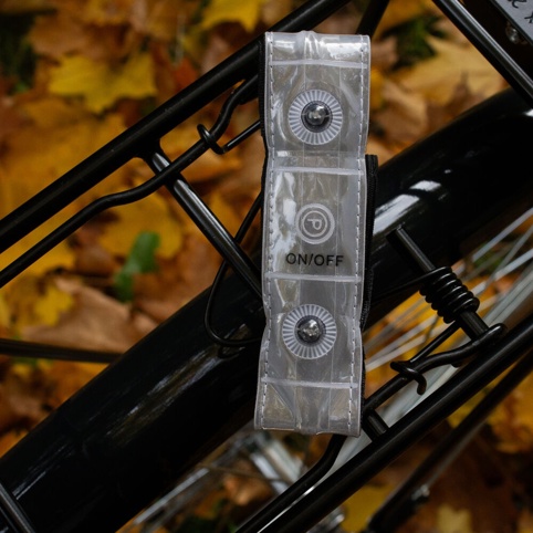 Det har justerbart velcrobånd, der gør det nemt at tage af og på samt justere i størrelsen, så du kan sætte det fast om armen, benet, tasken, barnevognen eller cyklen. Refleksen måler 3 x 42 cm og er en 3M refleks i slidstærkt plast. Der medfølger 1 x CR2032 batteri.
