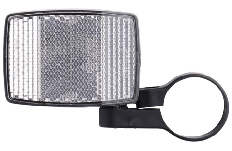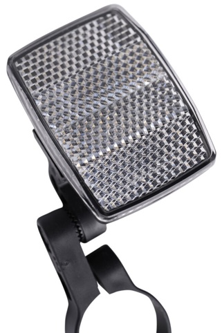 Har du en cykel på 2 hjul, er det et lovkrav, at den har mindst 1 hvid refleks foran og mindst 1 rød refleks bagpå. Her får en du en standard hvid refleks til montering foran på cyklen. Refleksen leveres inkl. holder i nylon og er nem at montere på din cykel – så bliver du langt mere synlig i trafikken.