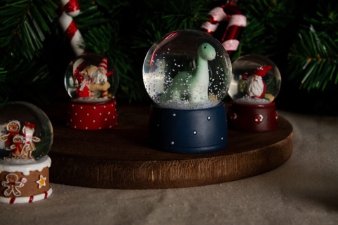 Vil du gerne have en magisk og sjov juleudsmykning i hjemmet? Så kan du overveje denne søde blå rystekugle med dino-motiv. Den skaber en flot og magisk juleeffekt i vindueskarmen eller på bordet. Inde i kuplen har sne og glimmer, som giver et flot udtryk, når den rystes. Du kan måske genkende den grønne dinosaur fra vores julefilm ’’skab noget magisk’’, der viser, hvordan du kan skabe en helt særlig og personlig julemagi. Kuglen er fremstillet af polyrecin og måler H: 10 cm x Ø: 6,5 cm.