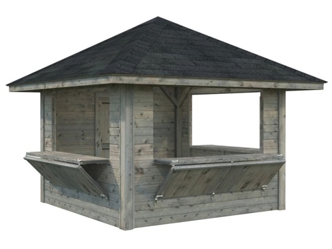 Her kan du finde denne Bianca 106 kiosk fra Palmako. Den har 3 store luger, som du kan lukke og låse. Derfor er den super-velegnet til forskellige formål, idet du bl.a. kan bruge den til julemarkeder, fodboldstadioner o.l. Den har masser af plads, da den har et indendørs areal på 8,3 m². Produktet er FSC®-mærket.