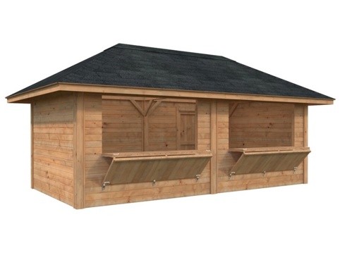 Her kan du finde denne Bianca 111 kiosk fra Palmako. Den har 2 store luger, som du kan lukke og låse. Derfor er den super-velegnet til forskellige formål, idet du bl.a. kan bruge den til julemarkeder, fodboldstadioner o.l. Den har masser af plads, da den har et indendørs areal på 16,6 m². Produktet er FSC®-mærket.
