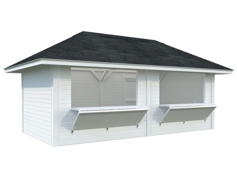 Her kan du finde denne Bianca 111 kiosk fra Palmako. Den har 2 store luger, som du kan lukke og låse. Derfor er den super-velegnet til forskellige formål, idet du bl.a. kan bruge den til julemarkeder, fodboldstadioner o.l. Den har masser af plads, da den har et indendørs areal på 16,6 m². Produktet er FSC®-mærket.