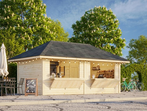 Her kan du finde denne Bianca 111 kiosk fra Palmako. Den har 2 store luger, som du kan lukke og låse. Derfor er den super-velegnet til forskellige formål, idet du bl.a. kan bruge den til julemarkeder, fodboldstadioner o.l. Den har masser af plads, da den har et indendørs areal på 16,6 m². Produktet er FSC®-mærket.