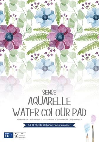 <h2>Blok med 20 ark i A4 til maling med vandfarver</h2><p>Du finder her en blok fra Sense med 20 ark udviklet til akvarelmaling. Du kan både bruge flydende og faste vandfarver. Blokken består af 20 ark, der er firkornede. Den vejer 200 g/m2 og er fra <a href="https://www.silvan.dk/baeredygtighed/fsc-maerket">FSC®</a>-certificeret træ, der kommer fra ansvarligt drevne skove.</p>