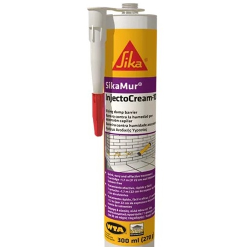 SikaMur® InjectoCream-100 er en fugtspærre til effektiv standsning af opstigende fugt i murværk. Den vandafvisende creme pumpes ind i vandrette borede huller i mørtelfugen, hvor den fordeler sig i den fugtige væg og danner en effektiv barriere mod fremtidig fugtoptrængning. Produktet kan bruges til både massive murstensvægge, hulmure samt kampestensfundamenter og stenfyldte vægge. InjectoCream-100 er en 1-komponent, som er klar til brug, og den kan påføres ved en temperatur på +5-35 °C.