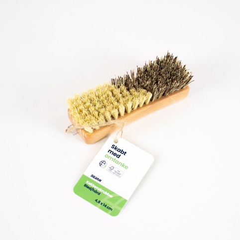 Med Skabt med omtanke-mærket gør vi det nemmere for dig at vælge de mest miljøvenlige produkter i vores sortiment. Køkkenskrubberen er fra Silvans eget mærke, Skabt med omtanke, og skaftet er af FSC-mærket bøgetræ og stammer dermed fra ansvarlig skovdrift. De bløde børstehår består af 100 % unionshår, og de hårde børstehår er af 100 % tampicoplantefibre. Køkkenskrubberen måler 4,8 cm x 14 cm.