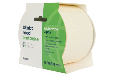 Vil du gerne male skarpe kanter eller beskytte områder såsom lister, karme og vinduer, når du maler hjemmet, er malertape et uundværligt redskab, der gør dit arbejde nemmere og hurtigere. Her får du en samlet pakke med 3 ruller malertape, der måler hhv. 19, 25 og 38 mm i bredden, så du kan afdække forskellige områder. Tapen fra Silvans eget mærke, Skabt med omtanke, er lavet af FSC®-certificeret papir, der er modstandsdygtigt over for opløsningsmidler og sikrer, at maling ikke trænger igennem.
