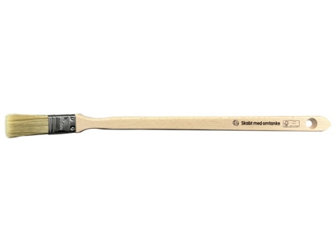 Denne vinkelpensel er med et langt skaft, så du bedre kan nå høje hjørner, lofter elle ned bag radiatoren. Penslen har bløde, hårdføre børstehår af syntetisk materiale der gør den egnet til indendørs brug. Skaftet er fremstillet af FSC®-certificeret bøgetræ, og samlingen er lavet af rustfrit stål. Det er derfor en modstandsdygtig pensel, der kan holde i lang tid. Ophængshullet i skaftet gør det nemt at opbevare penslen eller hænge den til tørre, efter den er rengjort.