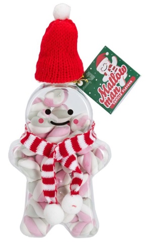 Denne charmerende plastbeholder er formet som en peberkagemand, og den er fyldt med 80 g luftige, vaniljesmagende skumfiduser i rosa og hvide farver. Figuren er pyntet med en strikket rød nissehue med kvast og et rød-/hvidstribet halstørklæde. Med sit søde smil og julet udtryk er den perfekt som kalendergave, julesnack eller en hyggelig overraskelse til både børn og voksne. En skøn julefavorit, der kombinerer sjov indpakning med lækker smag.