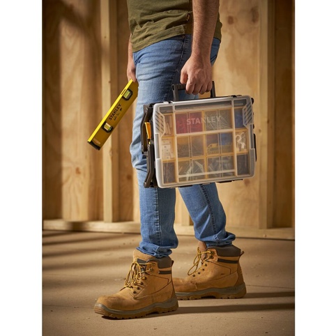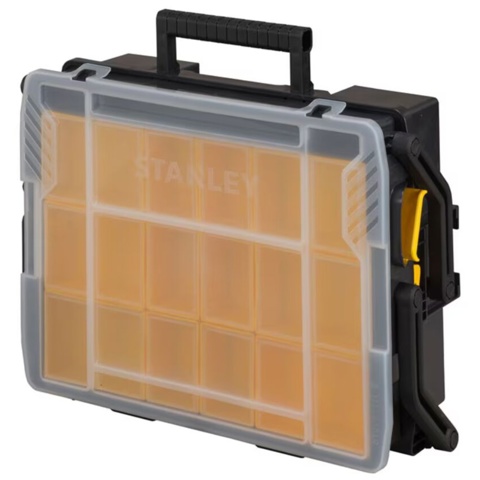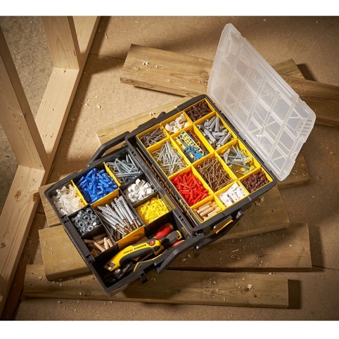 Leder du efter en sortimentskasse, der også kan bruges som værktøjskasse til mindre værktøj? Så er denne sortimentskasse et godt valg, da den har et dobbeltlag, hvilket giver flere muligheder for værktøjsopbevaring. Der er et gennemsigtigt låg, så du har mulighed for at se de små beholdere i det øverste lag. Derudover har den et ergonomisk design, som gør den nem at transportere som kuffert. Sortimentskassen måler 40 cm x 42 cm x 31,5 cm.
