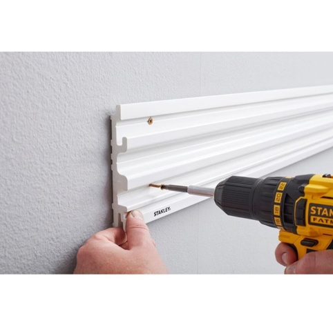 Har du brug for at udvide dit Track Wall System fra Stanley? Så er det nødvendigt med ekstra vægskinner. Her finder du netop en vægskinne, som passer til Track Wall Systemet. Vægskinnen måler 121x2,5x14 cm, og den kan nemt monteres med skruer og eventuelt plugs på bl.a. krydsfiner, mursten og gipsvægge. Vægskinnen har en bæreevne på til 143 kg. Bæreevnen afhænger dog også af underlaget og de skruer og plugs, som du bruger. Vægskinnerne er lavet af materiale, som er modstandsdygtigt over for rust og bøjning. Du har mulighed for nemt at tilskære og tilpasse de enkelte vægskinner.