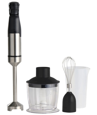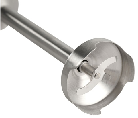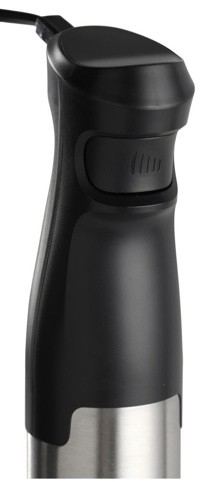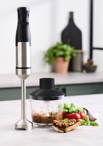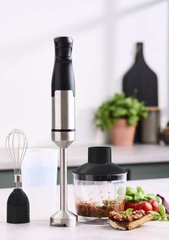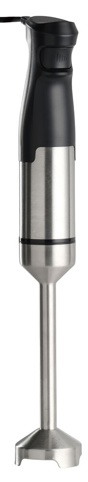 Blenderen har en aftagelig stav i rustfrit stål, som er nem at rengøre, og et ergonomisk plastikhåndtag med ståldetaljer, der giver et godt greb under brug. De skarpe rustfri stålblade sikrer en jævn tilberedning.