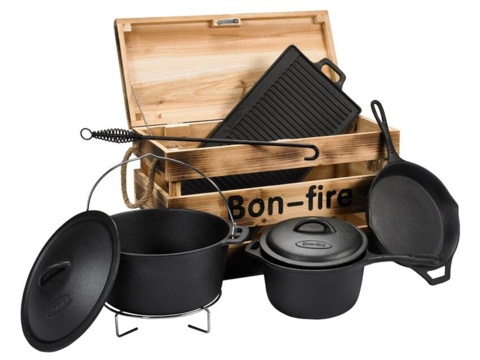 Støbejernsæt med 6 dele – nyttige redskaber til bålkøkkenet