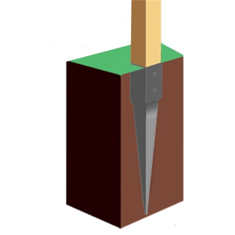 Du kan slå stolpespyddet i med en hammer (slå ikke direkte på spyddet). Du bør grave jorden fri omkring, der hvor stolpen skal monteres. Herefter monterer du med skruer med undersænket hoved. Husk du skal forbore i stolpen, før du monterer skruerne. OBS! Vi anbefaler, at du slår stolpespyddet i lod, indtil det ligger plant med jorden. For så kan du sikre, at spyddet har maks. styrke til at modstå vindtryk.