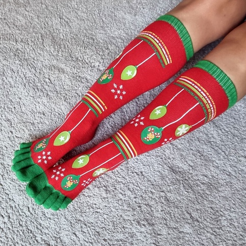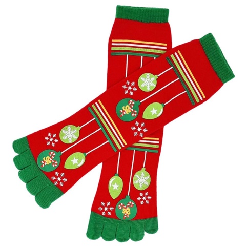 Tilføj ekstra juleglæde til dine fødder med disse farverige og sjove tåsokker, der er dekoreret med fine julekugler, snefnug og striber i klassiske julefarver rød, grøn og hvid. De er fremstillet i blødt og behageligt akrylgarn, der holder dine tæer varme og godt tilpas hele december. Sokkerne er perfekte som gave, til julefrokosten eller bare som en hyggelig detalje i hverdagen op til jul.