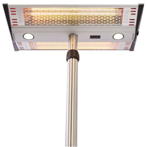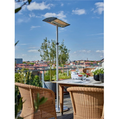 Denne terrassevarmer har 2 effekttrin på hhv. 1000 W og 2000 W. Der medfølger fjernbetjening så du kan styre varmen og tænde for de 2 indbyggede LED-pærer, når solen går ned. Kabinettet er fremstillet i ubehandlet aluminium og har derfor en fin, sølvfarvet overflade. Terrassevarmeren måler H: 220 x B: 65 c D: 65 cm. Det er en fritstående model, som du kan placere lige, hvor du ønsker på terrassen, i udestuen eller haven.