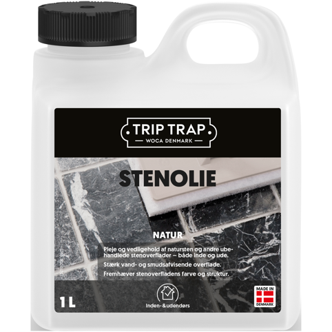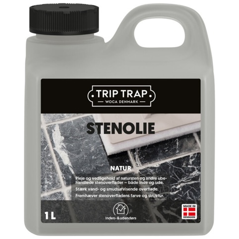 Stenolie fra Trip Trap er til pleje og vedligeholdelse af ubehandlede stenoverflader med åbne strukturer, som gør den velegnet til tegl, klinker og generelt natursten såsom granit og skiffer. Her vil olien fremhæve stenens naturlige farve og struktur, så overfladen får et flot og glansfuldt udtryk. Stenolien vil også give en stærk vand- og smudsafvisende effekt og er dermed både velegnet til indendørs og udendørs brug.
