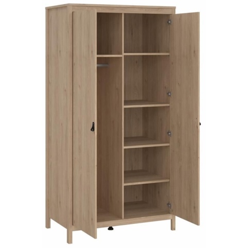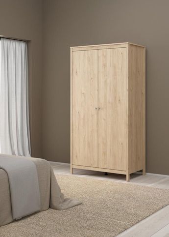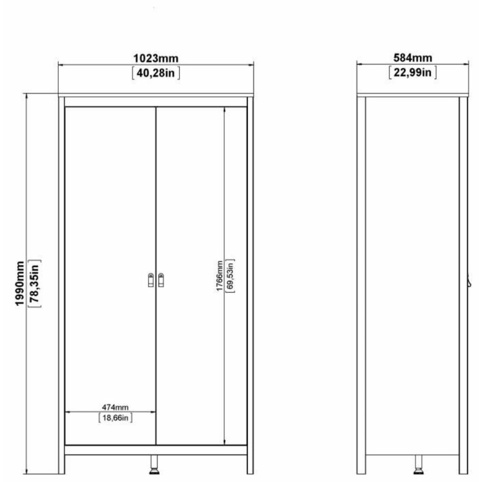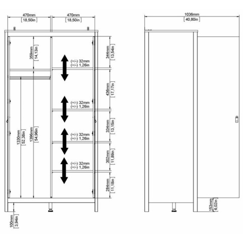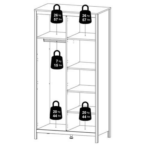Garderobeskabet har 2 låger. I rummet til venstre er der en bøjlestang til ophæng af skjorter, kjoler og jakker, mens der i rummet til højre er 4 hylder, som giver god plads til foldede t-shirts, bukser, strømper og sko. Skabet har en bredde på 102,3 cm, en dybde på 58,4 cm og en højde på 199 cm. Det leveres usamlet, og der medfølger sikkerhedsbeslag.