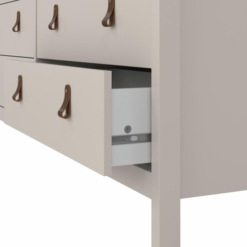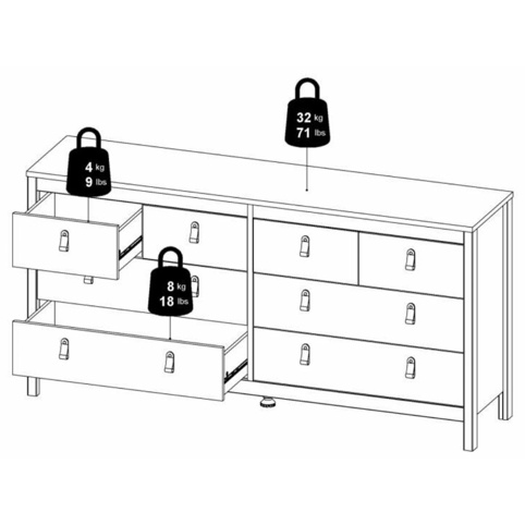 Kommoden har 4 store skuffer og 4 små skuffer, der giver god plads til alt fra t-shirts og strømper til sengetøj og andre småting i hjemmet. Skufferne kører på skinner med kuglelejer, hvilket gør, at de glider let og jævnt ind og ud – også når skuffen er fyldt op. Kommoden har en bredde på 159,6 cm, en dybde på 38,4 cm og en højde på 79,7 cm. Den leveres usamlet, og der medfølger sikkerhedsbeslag.