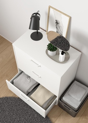 Sofia kommoden har et minimalistisk design med matchende greb og fødder, der giver et stilrent udtryk, som passer godt ind i både soveværelse og entré. Denne model har 3 rummelige skuffer, der giver god plads til alt fra t-shirts og strømper til sengetøj og andre småting i hjemmet. Skufferne kører på skinner med kuglelejer, hvilket gør, at de glider let og jævnt ind og ud – også når skuffen er fyldt op. Kommoden har en bredde på 70,2 cm, en dybde på 39,8 cm og en højde på 82,7 cm. Den leveres usamlet, og der medfølger sikkerhedsbeslag.