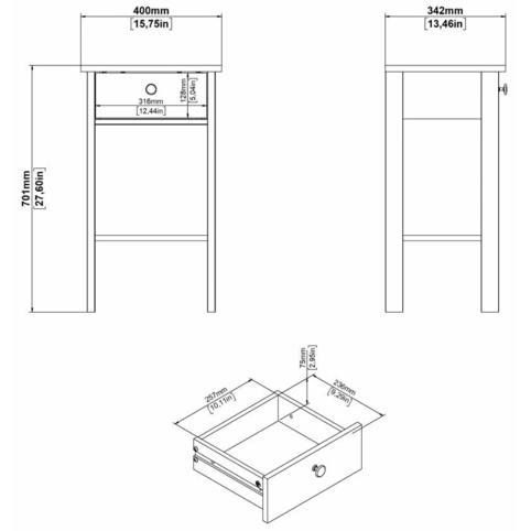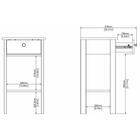 Natbordet har en skuffe og en hylde for nem opbevaring af bøger, briller og andre småting, du gerne vil have lige ved hånden. Det har en bredde på 40 cm, en dybde på 34,2 cm og en højde på 70,1 cm.