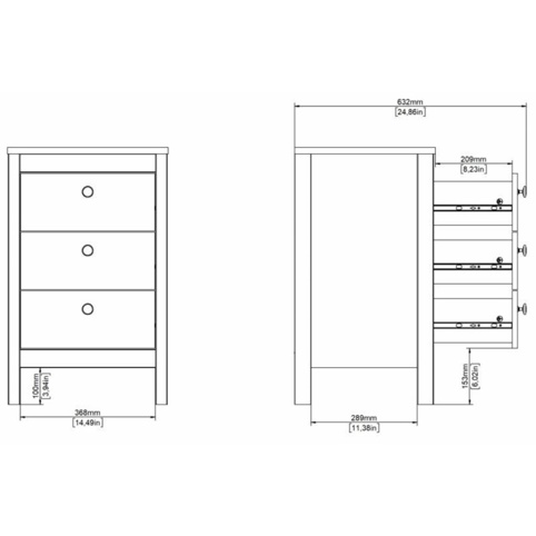 Natbordet har 3 skuffer for nem opbevaring af bøger, briller og andre småting, du gerne vil have lige ved hånden. Det har en bredde på 43,8 cm, en dybde på 38,4 cm og en højde på 70,1 cm.