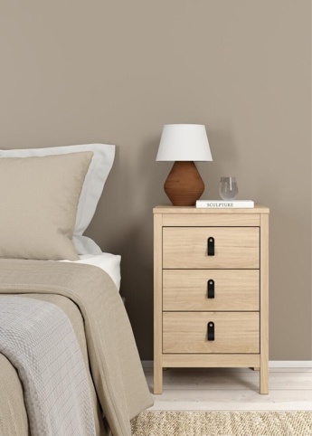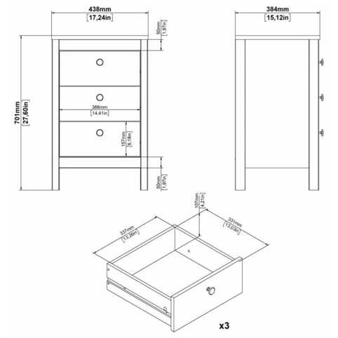 Natbordet har 3 skuffer for nem opbevaring af bøger, briller og andre småting, du gerne vil have lige ved hånden. Det har en bredde på 43,8 cm, en dybde på 38,4 cm og en højde på 70,1 cm.