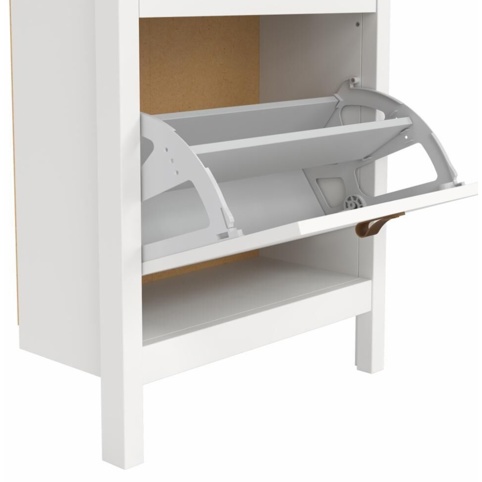 Skoskabet er en pladsbesparende løsning til opbevaring og organisering af sko. Det har 2 rum med låger, der åbner nedad. Der er plads til ca. 8 par sko – 4 par i hvert rum – alt efter skoens type og størrelse. Skoskabet har en bredde på 53,8 cm, en dybde på 24,6 cm og en højde på 102,9 cm. Det leveres usamlet, og der medfølger sikkerhedsbeslag.