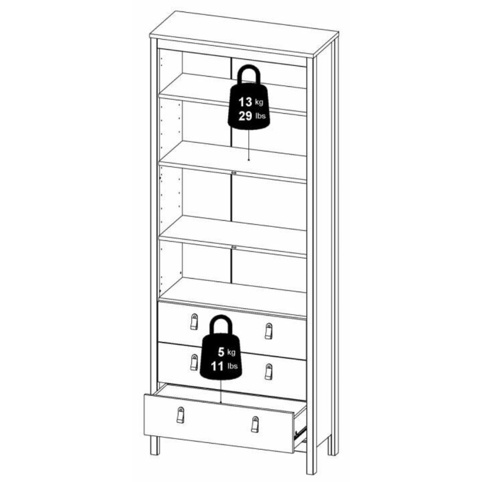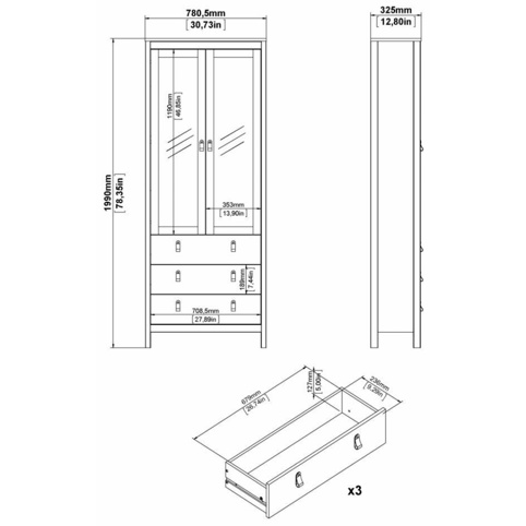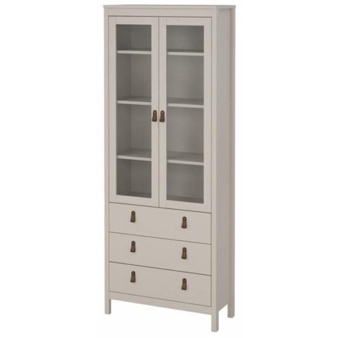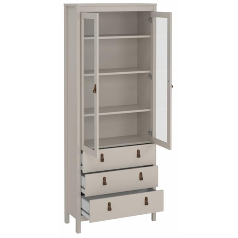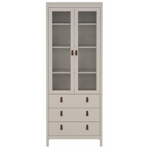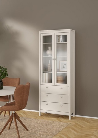 Nederst har vitrineskabet tre rummelige skuffer, der giver god plads til duge, borddækningstilbehør og andre småting du gerne vil have gemt af vejen. Øverst har skabet 3 hylder bag 2 glaslåger, der giver mulighed for at opbevare dine ting, så de kan ses, men stadig er beskyttet mod støv. Vitrineskabet har en bredde på 78 cm, en dybde på 32,5 cm og en højde på 199 cm. Den leveres usamlet, og der medfølger sikkerhedsbeslag.