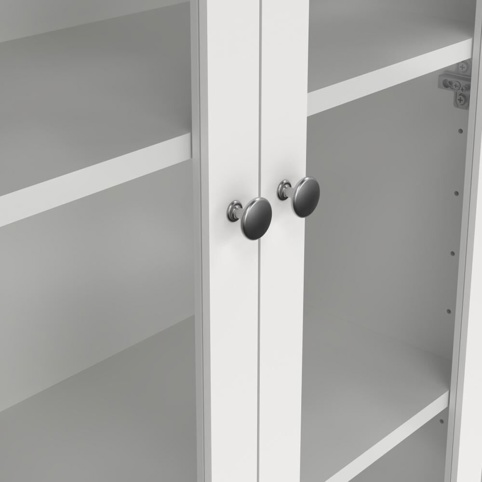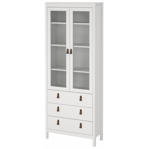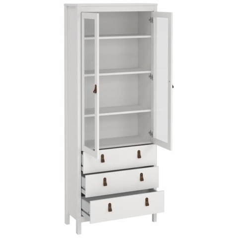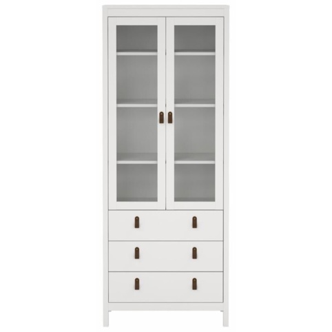 Nederst har vitrineskabet tre rummelige skuffer, der giver god plads til duge, borddækningstilbehør og andre småting du gerne vil have gemt af vejen. Øverst har skabet 3 hylder bag 2 glaslåger, der giver mulighed for at opbevare dine ting, så de kan ses, men stadig er beskyttet mod støv. Vitrineskabet har en bredde på 78 cm, en dybde på 32,5 cm og en højde på 199 cm. Den leveres usamlet, og der medfølger sikkerhedsbeslag.