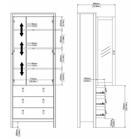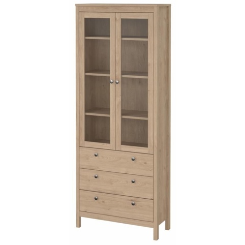 <h2>Elegant Madrid-vitrineskab med 2 glaslåger og 3 skuffer</h2><p>Dette vitrineskab fra Madrid-serien giver dig både praktisk opbevaring og et roligt, moderne udtryk i rummet. Designet er enkelt og elegant, så det passer ind i de fleste indretninger – uanset om du er mere til det minimalistiske eller det mere klassiske look. Samtidig medfølger der 2 forskellige greb til møblet, så du kan vælge det look, der passer bedst ind i dit hjem.<br><br>Nederst har vitrineskabet tre rummelige skuffer, der giver god plads til duge, borddækningstilbehør og andre småting du gerne vil have gemt af vejen. Øverst har skabet 3 hylder bag 2 glaslåger, der giver mulighed for at opbevare dine ting, så de kan ses, men stadig er beskyttet mod støv. Vitrineskabet har en bredde på 78 cm, en dybde på 32,5 cm og en højde på 199 cm. Den leveres usamlet, og der medfølger sikkerhedsbeslag.</p>