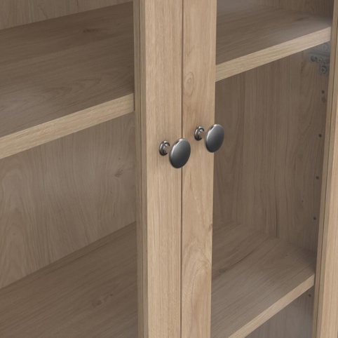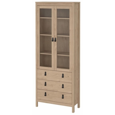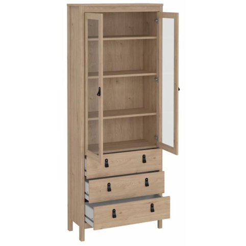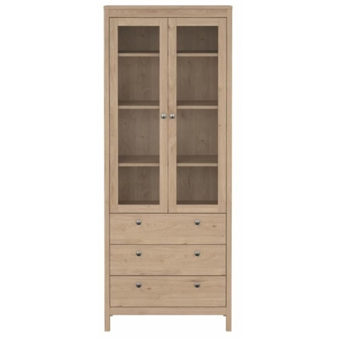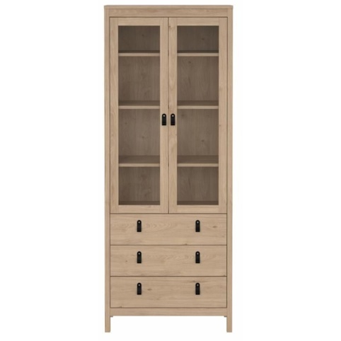 Nederst har vitrineskabet tre rummelige skuffer, der giver god plads til duge, borddækningstilbehør og andre småting du gerne vil have gemt af vejen. Øverst har skabet 3 hylder bag 2 glaslåger, der giver mulighed for at opbevare dine ting, så de kan ses, men stadig er beskyttet mod støv. Vitrineskabet har en bredde på 78 cm, en dybde på 32,5 cm og en højde på 199 cm. Den leveres usamlet, og der medfølger sikkerhedsbeslag.