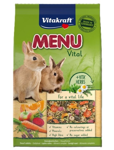 Vitakraft Menu Vital er et velsmagende fuldfoder til dværgkaniner, der kan bruges som daglig hovedfoder. Blandingen er udviklet til at give dit marsvin en afbalanceret kost med de næringsstoffer, som den har brug for til et sundt og aktivt liv. Foderet indeholder vitaminer, mineraler og et højt fiberindhold, som understøtter både fordøjelse og generel trivsel. Blandingen er tilsat VITA-urter (timian, kamille og persille, som gør foderet ekstra appetitligt og varieret, samtidig er det hverken tilsat sukker, farvestoffer eller konserveringsmidler.