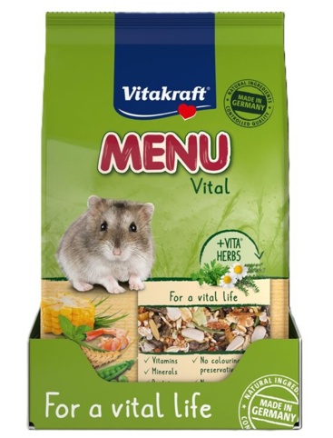 Vitakraft Menu Vital er et velsmagende fuldfoder til dværghamstre, der kan bruges som daglig hovedfoder. Blandingen er udviklet til at give dit marsvin en afbalanceret kost med de næringsstoffer, som det har brug for til et sundt og aktivt liv. Foderet indeholder vitaminer, mineraler og et højt fiberindhold, der understøtter både fordøjelse og generel trivsel. Blandingen er tilsat VITA-urter (timian, kamille og persille, som gør foderet ekstra appetitligt og varieret, samtidig er det hverken tilsat sukker, farvestoffer eller konserveringsmidler.