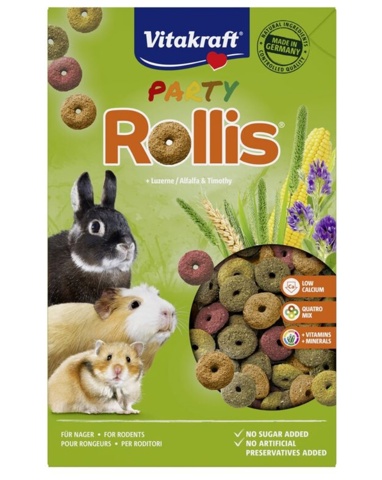 Vitakraft Party Rollis er små, ringformede snacks, der egner sig perfekt som en lille belønning til kaniner, marsvin og andre gnavere. De sprøde Rollis serveres som supplement til det daglige foder og kan både bruges i hånden, i en skål eller gemmes rundt i buret for ekstra aktivering. De forskellige farver gør snacken ekstra spændende for dit kæledyr og kan være med til at skabe hyggestunder, når I fodrer fra hånden og styrker kontakten mellem dyr og ejer.