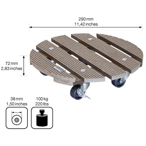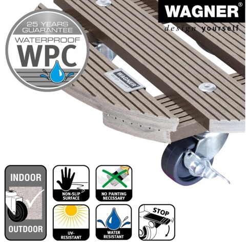 Dette Wagner rullebræt gør det nemt at flytte tunge krukker og plantekasser uden at ridse gulvet. Overfladen er ternet og splintsikker, så krukkerne står mere stabilt og ikke glider under brug. De fire letløbende hjul kører stabilt på både bløde og robuste gulvoverflader – og de måler hver Ø: 38 mm, og 2 af dem er udstyret med bremser. Denne plantevogn er ikke designet til transport af personer.