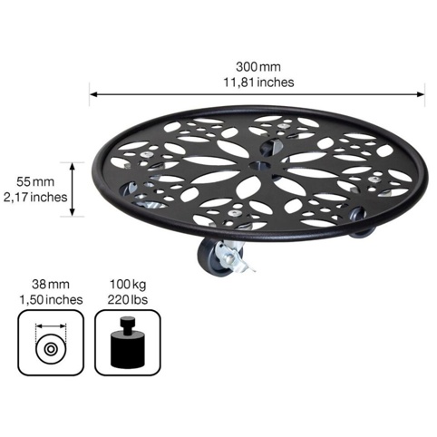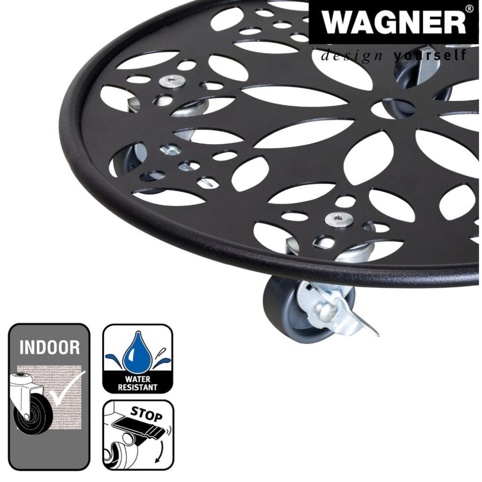Denne smukke plantevogn er udstyret med fire adrætte drejehjul, hvor to har bremser, så du undgår uønsket vækrulning – f.eks. på let ujævne gulvoverflader. Hjulenes hårde løbeflader giver god mobilitet på både bløde og robuste gulve. Produktet kan bruges både inde og i udendørsområder. Denne plantevogn er ikke designet til transport af personer.
